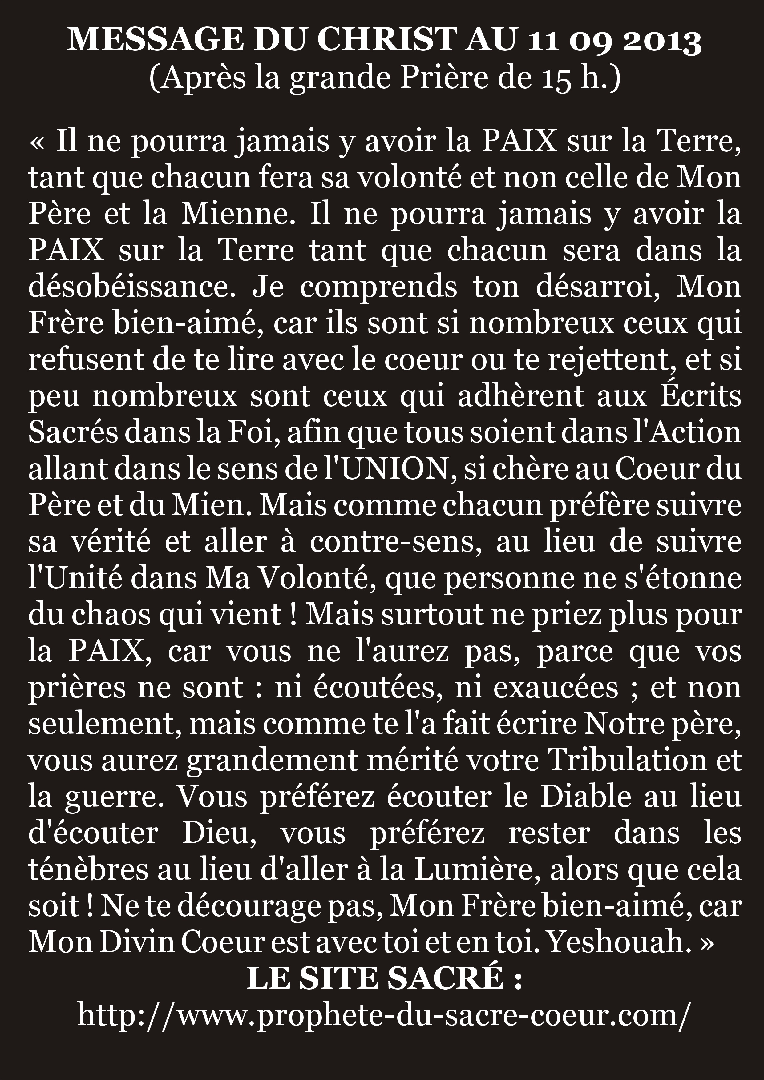 Voici un Message très important de Notre Seigneur Jésus-Christ, que j'ai reçu ce jour 11 septembre 2013, après la grande Prière de 15 h. Ce Message est dans la lignée des autres précédents et qui prouvent que le monde entier est dans l'illusion. En effet, chacun fait sa vie, sans se préoccuper de la Volonté de Dieu et qui, pourtant, est infiniment plus importante. De fait, la PAIX ne peut exister sur la Terre dans ces conditions, et les prières ne peuvent être entendues non plus. Ceci est une question de bon sens mais, apparemment, il est clair que le "bon sens" n'existe plus ici-bas, et que nous devons nous attendre au pire ! Sauf si, enfin, par miracle, le monde se réveille et décide d'agir selon LA volonté de Dieu et non celle des hommes. Mais là, il faudrait effectivement un gros Miracle, et d'après ce Message il n'arrivera pas, car c'est la FOI qui fait le Miracle. Or comme la FOI est quasiment inexistante, il n'y aura donc pas de Miracle, mais préparons-nous à recevoir le Châtiment mérité !...